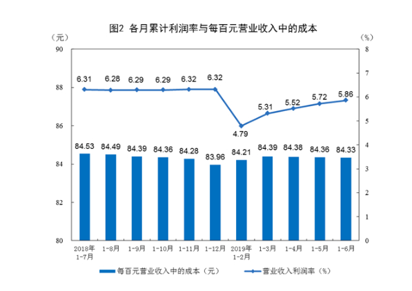 1—6月份,规模以上工业企业每百元营业收入中的成本为84.33元,同比增加0.22元;每百元营业收入中的费用为8.66元,同比增加0.21元。