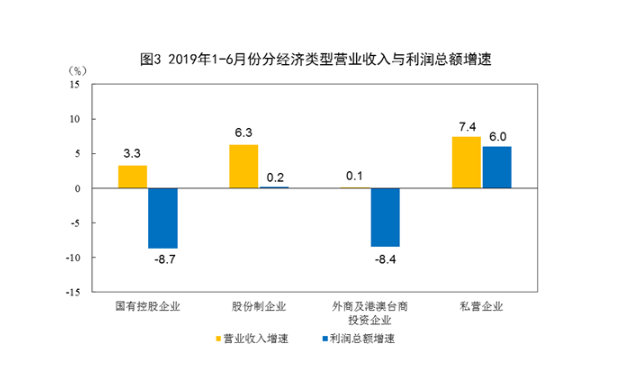 1—6月份,规模以上工业企业中,国有控股企业实现利润总额9368.8亿元,同比下降8.7%;股份制企业实现利润总额21390.6亿元,增长0.2%;外商及港澳台商投资企业实现利润总额7186.2亿元,下降8.4%;私营企业实现利润总额7430.7亿元,增长6.0%。