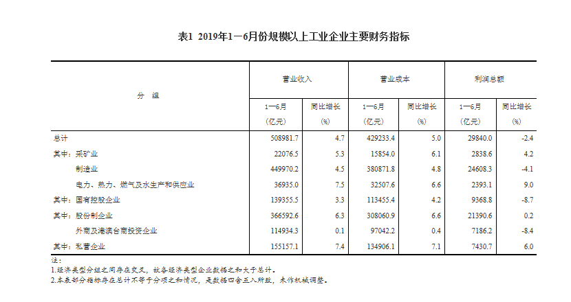 1—6月份,全国规模以上工业企业实现利润总额29840.0亿元,同比下降2.4%(按可比口径计算,考虑统计制度规定的口径调整、统计执法增强、剔除重复数据、企业改革剥离、四经普单位清查等因素影响,详见附注四),降幅比1—5月份扩大0.1个百分点。