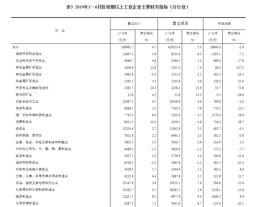 1—6月份,采矿业实现利润总额2838.6亿元,同比增长4.2%;制造业实现利润总额24608.3亿元,下降4.1%;电力、热力、燃气及水生产和供应业实现利润总额2393.1亿元,增长9.0%。