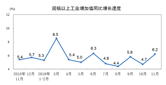 2019年11月份,规模以上工业增加值同比实际增长6.2%(以下增加值增速均为扣除价格因素的实际增长率),比10月份加快1.5个百分点。从环比看,11月份,规模以上工业增加值比上月增长0.78%。1—11月份,规模以上工业增加值同比增长5.6%。