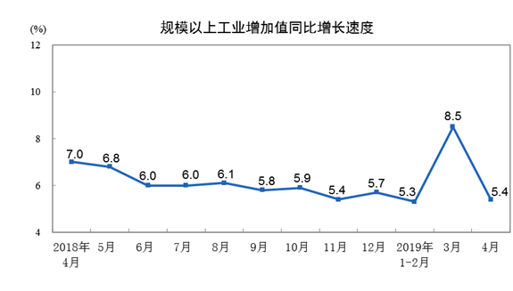 2019年4月份,规模以上工业增加值同比实际增长5.4 %(以下增加值增速均为扣除价格因素的实际增长率),比3月份回落3.1个百分点。从环比看,4月份,规模以上工业增加值比上月增长0.37%。1-4月份,规模以上工业增加值同比增长6.2%。 [详细]