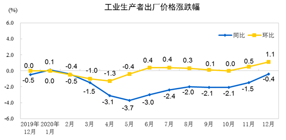 12月份,国内需求稳定恢复,加之部分国际大宗商品价格持续攀升,带动工业品价格继续上行。从环比看,PPI上涨1.1%,涨幅比上月扩大0.6个百分点。其中,生产资料价格上涨1.4%,涨幅扩大0.7个百分点;生活资料价格上涨0.1%,涨幅与上月相同。主要行业中,受国际原油价格上涨等因素影响,石油和天然气开采业价格上涨7.9%,石油、煤炭及其他燃料加工业价格上涨5.3%,化学原料和化学制品制造业价格上涨2.3%,涨幅均有所扩大,合计影响PPI上涨约0.37个百分点。随着国内市场需求持续回暖,加之铁矿石和有色金属等国际大宗商品价格上涨较多,金属相关行业价格继续上涨,其中有色金属冶炼和压延加工业价格上涨3.9%,黑色金属冶炼和压延加工业价格上涨3.3%,涨幅分别扩大2.8和1.8个百分点,合计影响PPI上涨约0.37个百分点。由于年底气温较常年同期偏低,供暖需求快速增加,带动燃气生产和供应业价格上涨4.1%,煤炭开采和洗选业价格上涨3.5%,涨幅均扩大1.3个百分点。农副食品加工业价格上涨1.0%,涨幅扩大0.2个百分点。