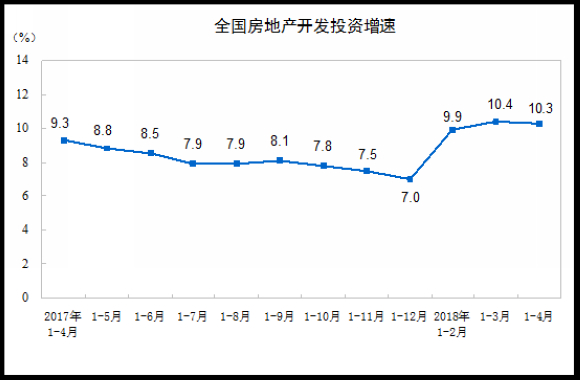 2018年1-4月份,全国房地产开发投资30592亿元,同比名义增长10.3%,增速比1-3月份回落0.1个百分点。其中,住宅投资21331亿元,增长14.2%,增速提高0.9个百分点。住宅投资占房地产开发投资的比重为69.7%。