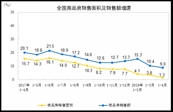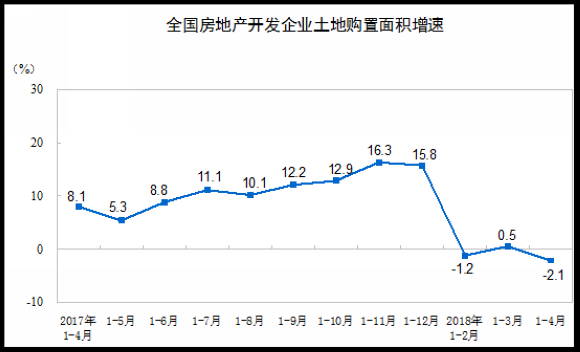 1-4月份,房地产开发企业土地购置面积5412万平方米,同比下降2.1%,1-3月份为增长0.5%;土地成交价款2391亿元,增长13.6%,增速回落6.7个百分点。