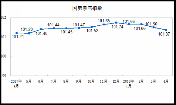 4月份,房地产开发景气指数(简称“国房景气指数”)为101.37,比3月份回落0.13点。