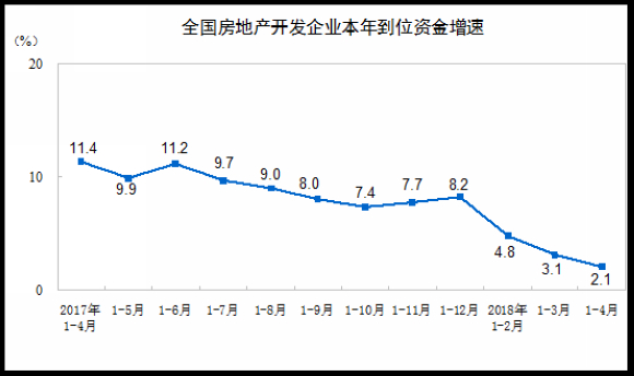 1-4月份,房地产开发企业到位资金48192亿元,同比增长2.1%,增速比1-3月份回落1个百分点。其中,国内贷款8637亿元,下降1.6%;利用外资17亿元,下降77.6%;自筹资金14894亿元,增长4.8%;定金及预收款14987亿元,增长8.3%;个人按揭贷款7148亿元,下降6.7%。