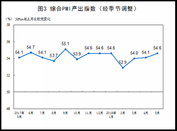 2018年5月份,综合PMI产出指数为54.6%,高于上月0.5个百分点,继续位于临界点以上,表明我国企业生产经营活动总体扩张步伐有所加快。