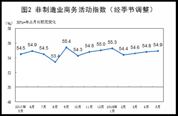 2018年5月份,中国非制造业商务活动指数为54.9%,比上月上升0.1个百分点,非制造业总体延续稳中有升的发展势头。