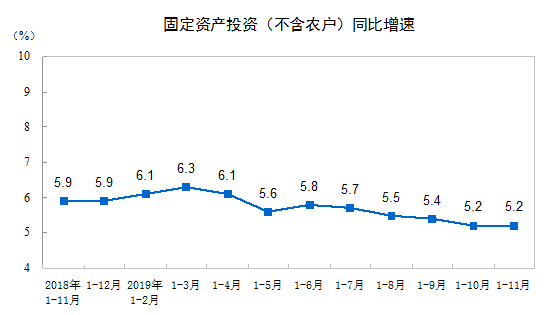 2019年1-11月份全国固定资产投资(不含农户)增长5.2%