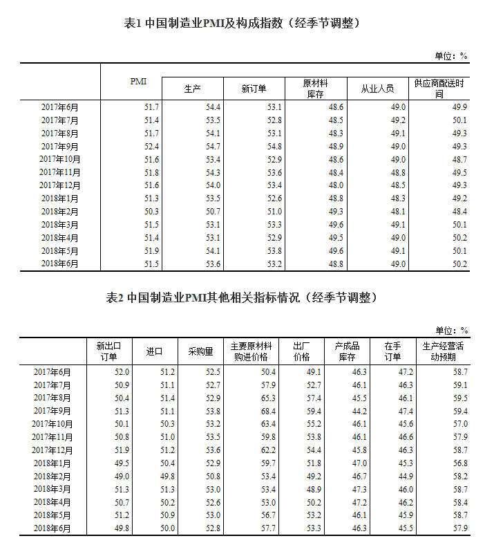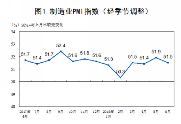 2018年6月份,中国制造业采购经理指数(PMI)为51.5%,比上月回落0.4个百分点,仍高于上半年均值0.2个百分点,制造业总体继续保持扩张态势。