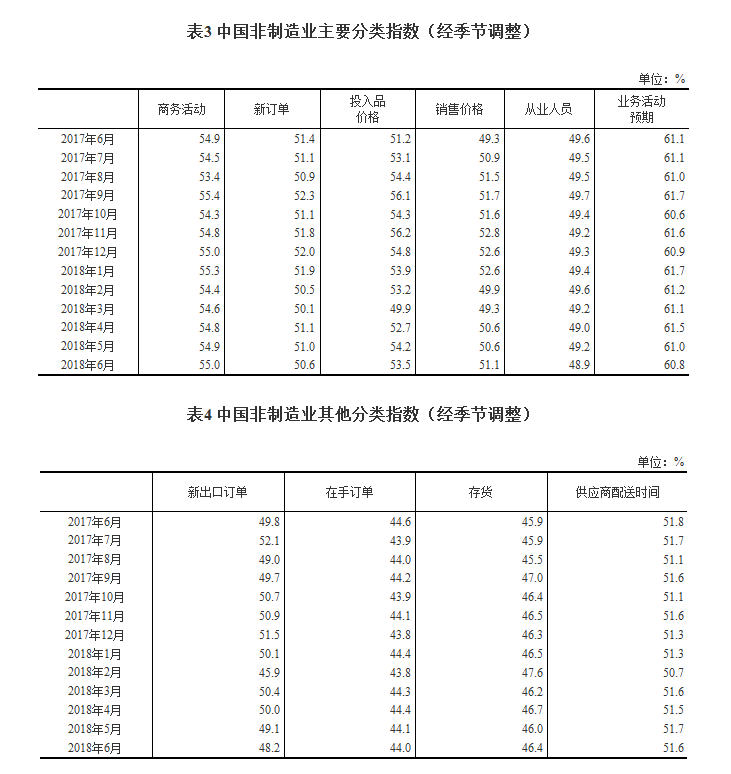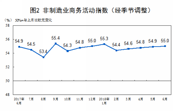 2018年6月份,中国非制造业商务活动指数为55.0%,比上月上升0.1个百分点,高于上半年均值0.2个百分点,非制造业总体保持平稳向好的发展势头。