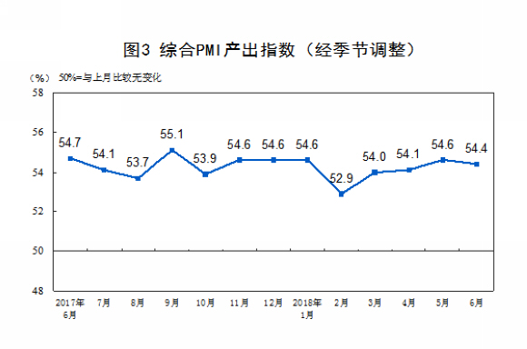 2018年6月份,综合PMI产出指数为54.4%,低于上月0.2个百分点,仍高于上半年均值0.3个百分点,继续位于临界点以上,表明我国企业当期生产经营活动总体延续平稳较快的扩张态势。