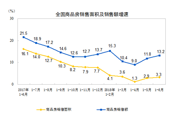 1-6月份,商品房销售面积77143万平方米,同比增长3.3%,增速比1-5月份提高0.4个百分点。其中,住宅销售面积增长3.2%,办公楼销售面积下降6.1%,商业营业用房销售面积增长2.4%。商品房销售额66945亿元,增长13.2%,增速提高1.4个百分点。其中,住宅销售额增长14.8%,办公楼销售额下降3.2%,商业营业用房销售额增长5.7%。