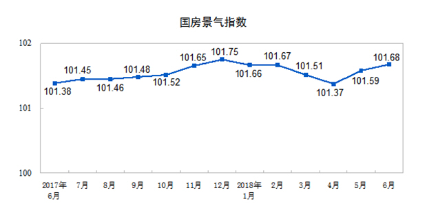 6月份,房地产开发景气指数(简称“国房景气指数”)为101.68,比5月份提高0.09点。