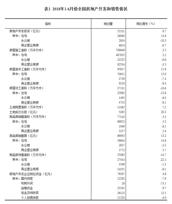 6月末,商品房待售面积55083万平方米,比5月末减少927万平方米。其中,住宅待售面积减少642万平方米,办公楼待售面积减少47万平方米,商业营业用房待售面积减少168万平方米。