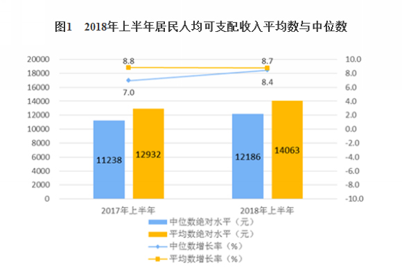 上半年,全国居民人均可支配收入中位数12186元,增长8.4%,中位数是平均数的86.7%。其中,城镇居民人均可支配收入中位数18048元,增长7.4%,是平均数的91.3%;农村居民人均可支配收入中位数6045元,增长8.7%,是平均数的84.6%。
