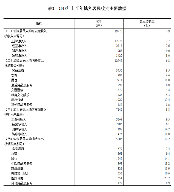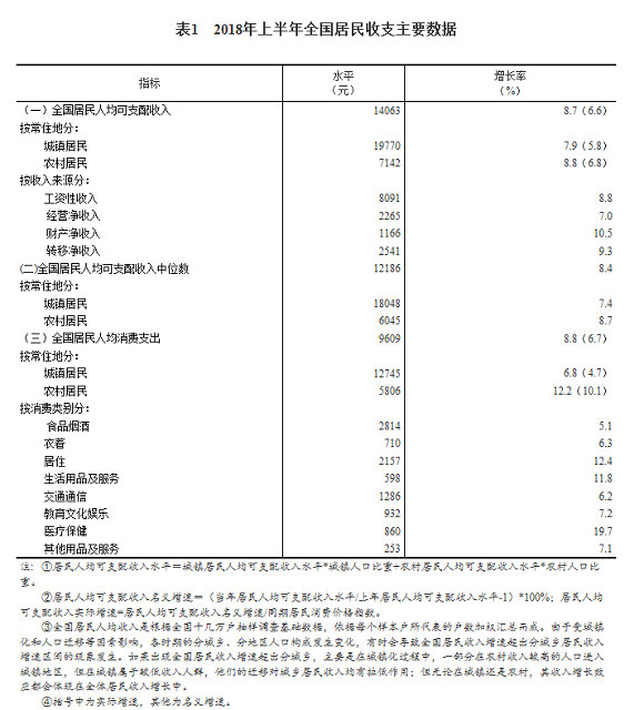 2018年上半年,全国居民人均可支配收入14063元,比上年同期名义增长8.7%,扣除价格因素,实际增长6.6%。其中,城镇居民人均可支配收入19770元,增长(以下如无特别说明,均为同比名义增长)