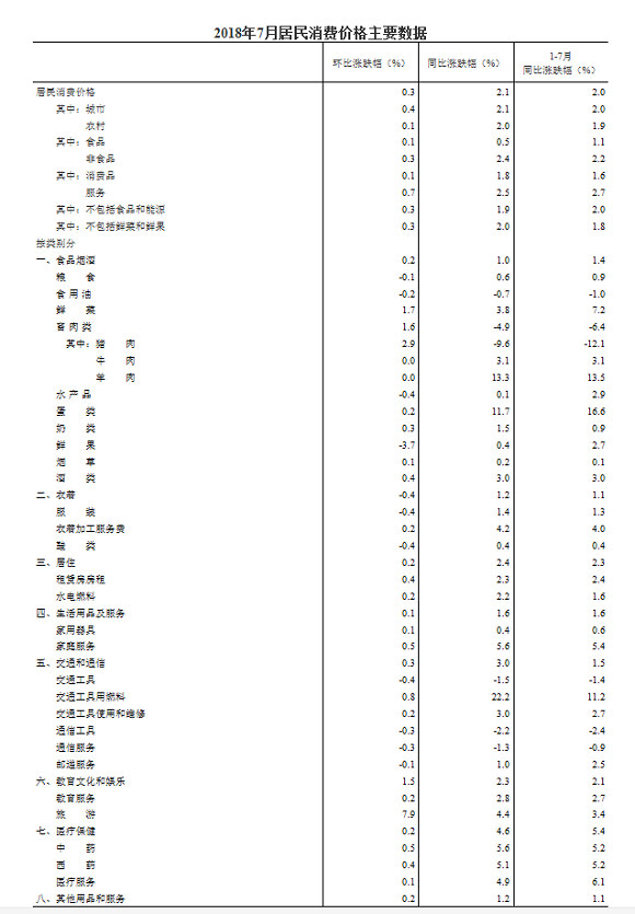 2018年7月份,全国居民消费价格同比上涨2.1%。其中,城市上涨2.1%,农村上涨2.0%;食品价格上涨0.5%,非食品价格上涨2.4%;消费品价格上涨1.8%,服务价格上涨2.5%。1-7月平均,全国居民消费价格比去年同期上涨2.0%。