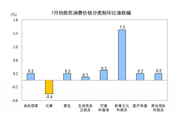 7月份,全国居民消费价格环比上涨0.3%。其中,城市上涨0.4%,农村上涨0.1%;食品价格上涨0.1%,非食品价格上涨0.3%;消费品价格上涨0.1%,服务价格上涨0.7%。