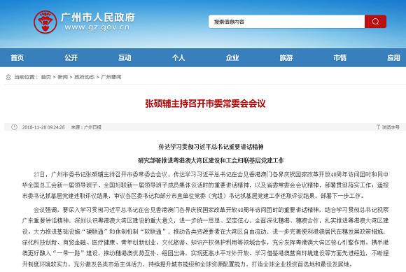 会议强调,要深入学习贯彻习近平总书记在会见香港澳门各界庆祝国家改革开放40周年访问团时的重要讲话精神,结合学习贯彻总书记视察广东重要讲话精神,深刻认识粤港澳大湾区建设的重大意义,进一步统一思想、坚定信心,全面深化穗港、穗澳合作,扎实推进粤港澳大湾区建设。大力推进基础设施“硬联通”和体制机制“软联通”,推动各类资源要素在大湾区自由流动,进一步完善便利港澳居民在穗发展政策措施,深化科技创新、商贸金融、医疗健康、青年创新创业、文化旅游、知识产权保护利用等领域合作,充分发挥粤港澳大湾区核心引擎作用。携手港澳更好融入“一带一路”建设,推动穗港澳优势互补、组团出海,实现更高水平对外开放。学习借鉴港澳营商环境建设等方面先进经验,不断提升制度环境软实力,充分激发各类市场主体活力,持续提升城市能级和全球资源配置能力,打造全球企业投资首选地和最佳发展地。