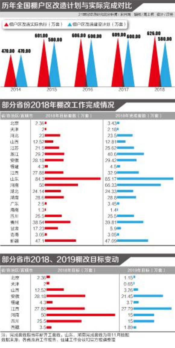 而根据21世纪经济研究院分析师的不完全统计,在已经召开地方两会并公布政府工作报告的省市中,除甘肃、青海等少数省份,2018年棚改实际完成套数与目标套数持平或未完成以外,多数省份均“超额”完成任务。