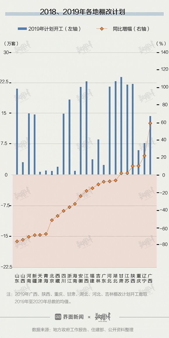 截至目前,已有多地召开地方两会和住房工作会议布置2019年的棚改工作。据界面数据(公众号ID:shujuxian_kuaikan)不完全统计,约20地棚改计划都出现下降,其中降幅最大的是山东、山西与河南,降幅均超过70%。
