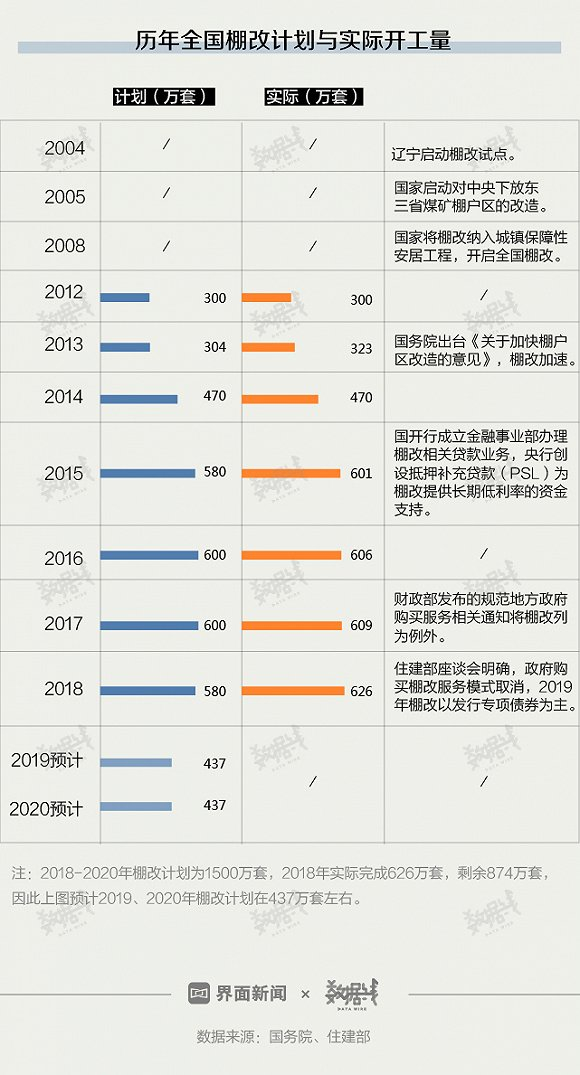 2008年至2018年,全国共改造各类棚户区近4500万套,预计2019年至2020年将新开工874万套,较前几年有所下降。