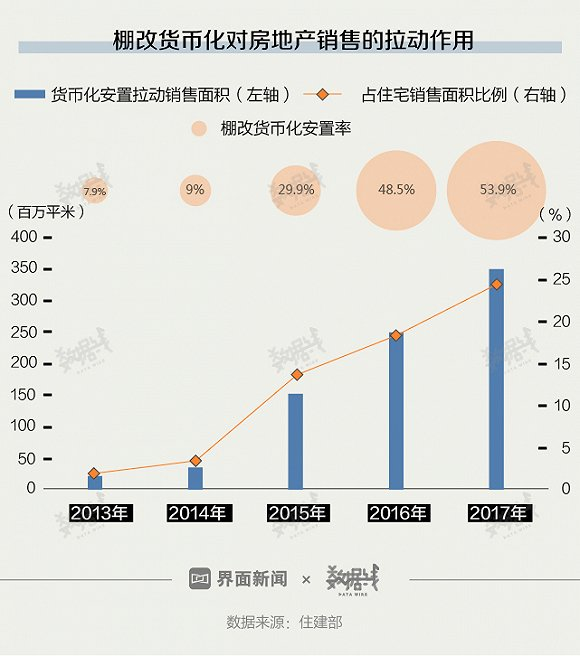 2013年至2017年,棚改货币化安置比例从7.9%升至53.9%,对住宅销售的贡献也从2%升至24%。