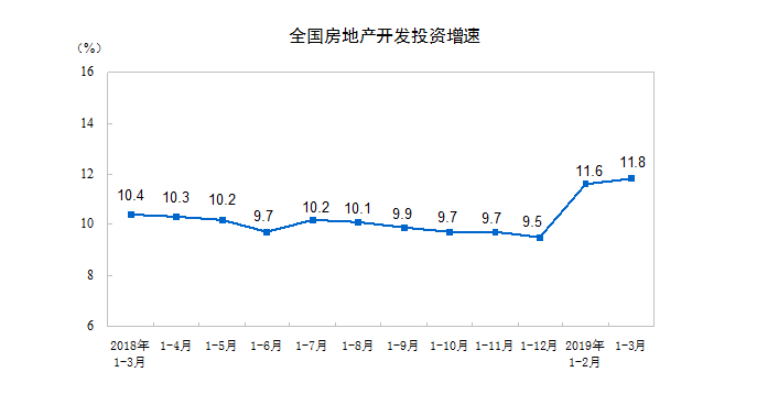 2019年1-3月份,全国房地产开发投资23803亿元,同比增长11.8%,增速比1-2月份提高0.2个百分点。其中,住宅投资17256亿元,增长17.3%,增速回落0.7个百分点。住宅投资占房地产开发投资的比重为72.5%。