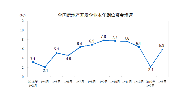 1-3月份,房地产开发企业到位资金38948亿元,同比增长5.9%,增速比1-2月份提高3.8个百分点。其中,国内贷款7134亿元,增长2.5%;利用外资33亿元,增长1.1倍;自筹资金11795亿元,增长3.0%;定金及预收款12303亿元,增长10.5%;个人按揭贷款5645亿元,增长9.4%。