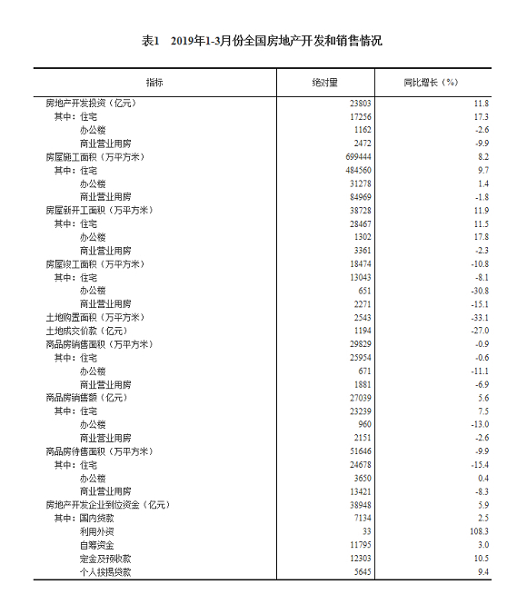 1-3月份,商品房销售面积29829万平方米,同比下降0.9%,降幅比1-2月份收窄2.7个百分点。其中,住宅销售面积下降0.6%,办公楼销售面积下降11.1%,商业营业用房销售面积下降6.9%。商品房销售额27039亿元,增长5.6%,增速提高2.8个百分点。其中,住宅销售额增长7.5%,办公楼销售额下降13.0%,商业营业用房销售额下降2.6%。