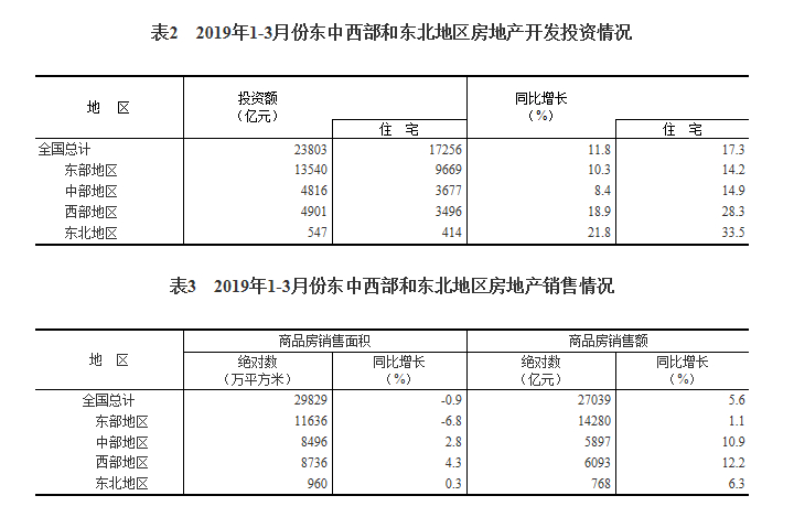 1-3月份,东部地区房地产开发投资13540亿元,同比增长10.3%,增速比1-2月份回落0.6个百分点;中部地区投资4816亿元,增长8.4%,增速回落0.4个百分点;西部地区投资4901亿元,增长18.9%,增速提高2.1个百分点;东北地区投资547亿元,增长21.8%,增速提高10.9个百分点。