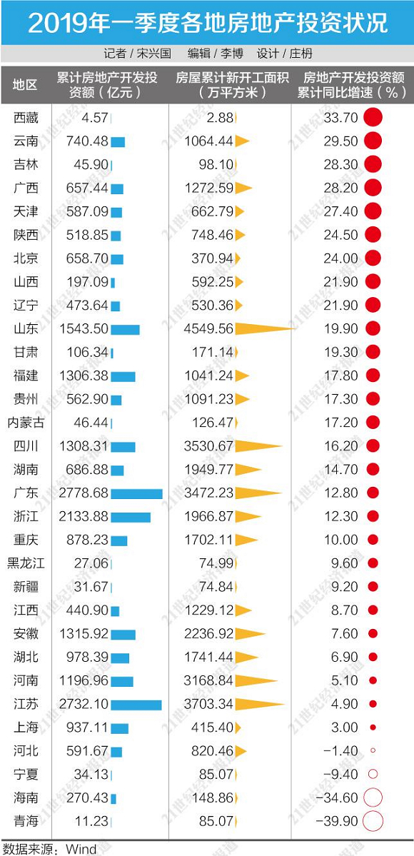 21世纪经济报道梳理各地陆续发布的一季度房地产投资状况发现,从总量来看,广东、江苏、浙江等东部房地产大省依然领衔,上述三省一季度房地产投资额均超过2000亿元。但从增速来看,过去并非房地产热点区域的西藏、云南、吉林、广西,以及此前受到严格调控压制的北京、天津等地,其市场投资热情在2019年持续高温。