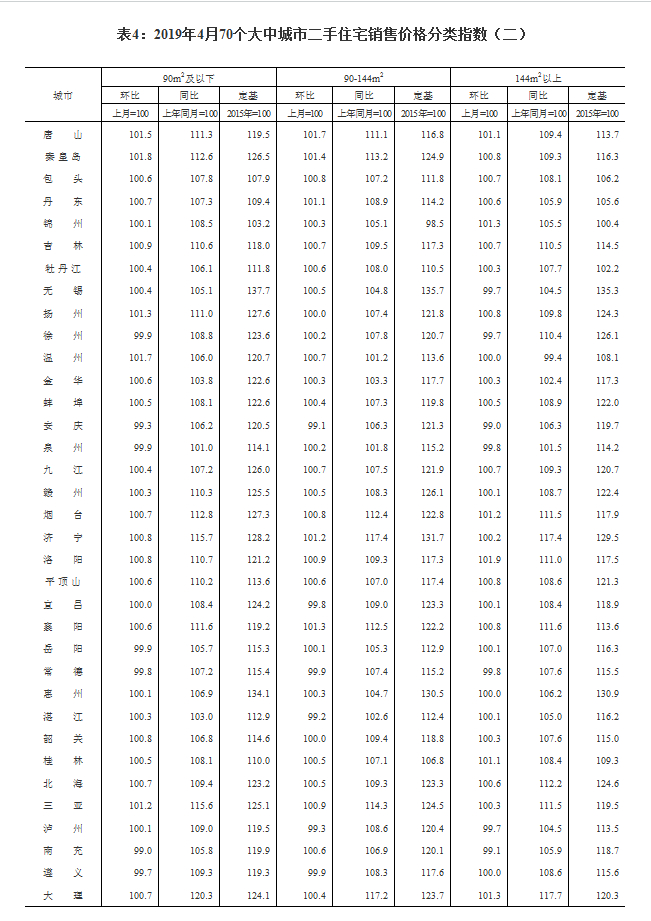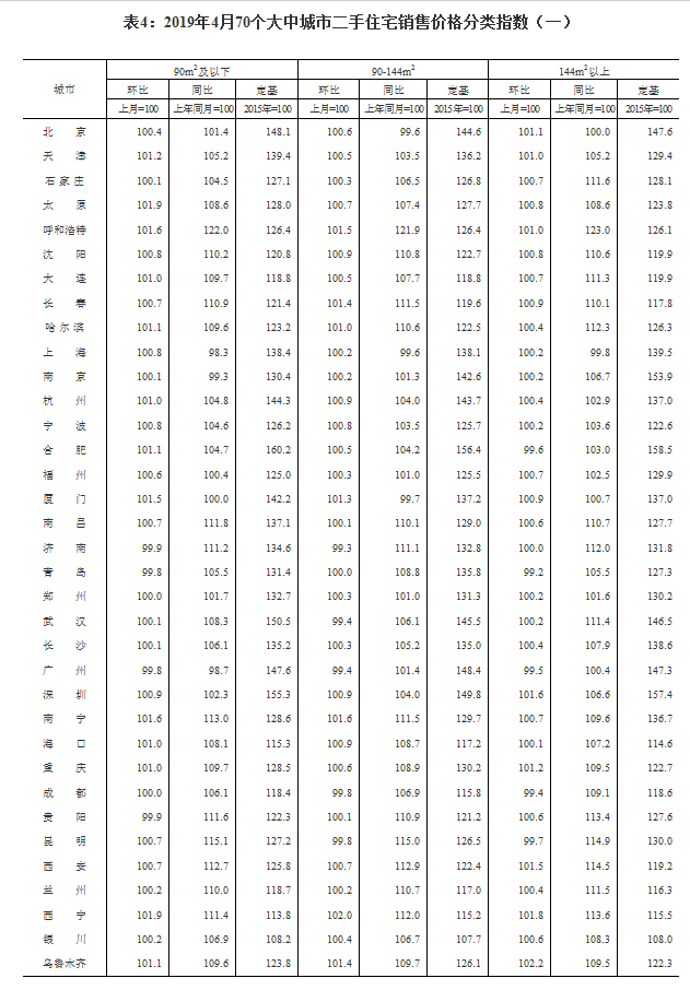 4月份,各地进一步落实好因城施策、一城一策、城市政府主体责任的长效调控机制,房地产市场基本延续平稳态势。4个一线城市新建商品住宅销售价格环比上涨0.6%,涨幅比上月扩大0.4个百分点。其中:北京、上海、广州和深圳分别上涨0.5%、0.3%、1.1%和0.4%。二手住宅销售价格环比上涨0.4%,涨幅比上月扩大0.1个百分点。其中:北京、上海和深圳分别上涨0.6%、0.5%和1.1%,广州下降0.4%。31个二线城市新建商品住宅销售价格环比上涨0.8%,涨幅比上月扩大0.2个百分点;二手住宅销售价格上涨0.6%,涨幅回落0.6个百分点。35个三线城市新建商品住宅销售价格环比上涨0.5%,涨幅比上月回落0.2个百分点;二手住宅销售价格上涨0.6%,涨幅扩大0.1个百分点。