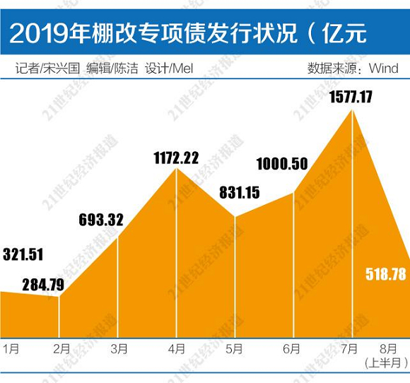 而在另一方面,地方政府棚改专项债方面,Wind数据显示,不排除置换债的前提下,截至8月中旬,各地发行的棚改专项债总额已经超过6300亿,额度已超出2018年总额的一倍以上。