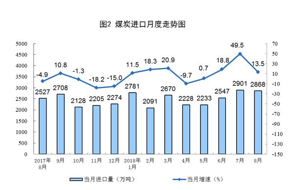8月份,煤炭进口2868万吨,比上月略降33万吨,但仍保持较高水平,同比增长13.5%。1-8月份,煤炭进口2.0亿吨,同比增长14.7%。