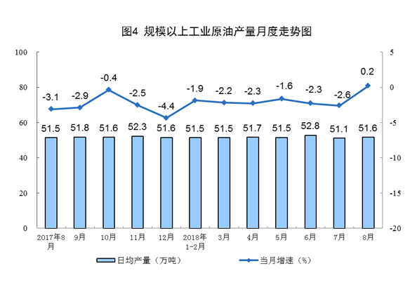 8月份,原油生产1600万吨,同比增长0.2%,上月为下降2.6%,为2015年11月以来首次正增长;日均产量51.6万吨,环比增加0.5万吨。1-8月份,原油产量12595万吨,同比下降1.8%。