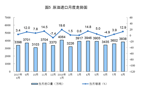 原油进口继续增加。8月份进口原油3838万吨,比上月增加236万吨,同比增长12.9%。1-8月份,进口原油29919万吨,同比增长6.5%。