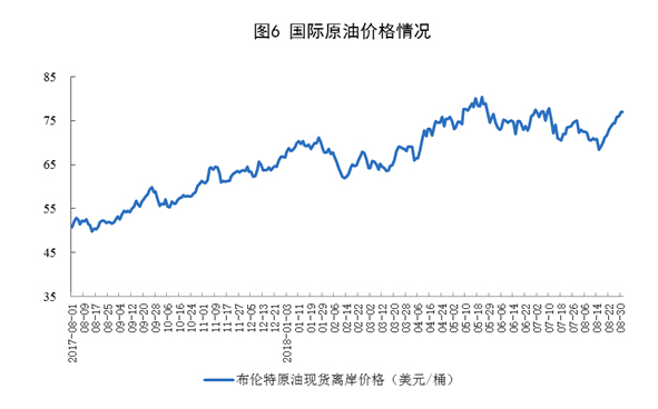 国际原油价格震荡上行。截至8月底,布伦特原油现货离岸价格为76.94美元/桶,比7月底上涨2.78美元/桶。