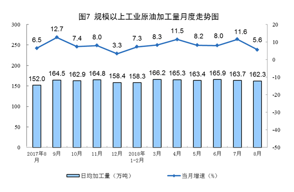 8月份,原油加工量5031万吨,同比增长5.6%,增速比上月回落6.0个百分点;日均加工162.3万吨,环比减少1.4万吨。1-8月份,原油加工量40041万吨,同比增长8.7%。