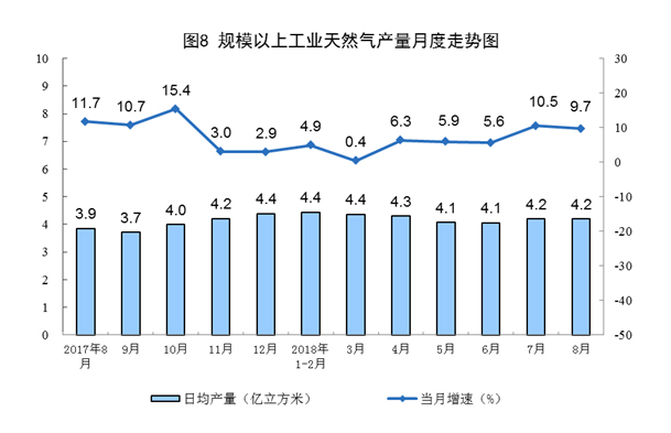 8月份,天然气产量129亿立方米,同比增长9.7%,增速比上月回落0.8个百分点;日均生产4.2亿立方米,与上月基本持平。1-8月份,天然气产量1040亿立方米,同比增长5.9%。