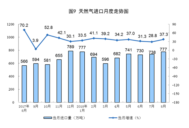 天然气进口持续高速增长。8月份,进口天然气777万吨,比上月增加39万吨,同比增长37.3%。1-8月份,进口天然气5718万吨,同比增长34.8%。