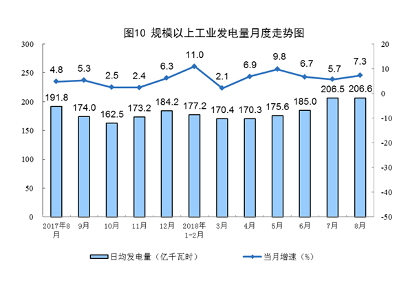 8月份,发电量6404.9亿千瓦时,同比增长7.3%,增速比上月加快1.6个百分点;日均发电206.6亿千瓦时,再创新高。1-8月份,发电量同比增长7.7%,比去年同期加快1.2个百分点。
