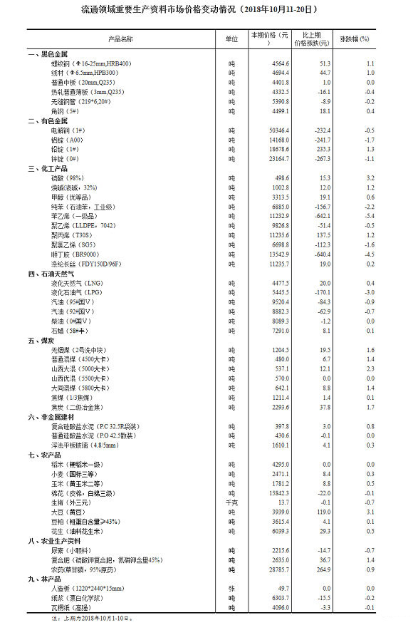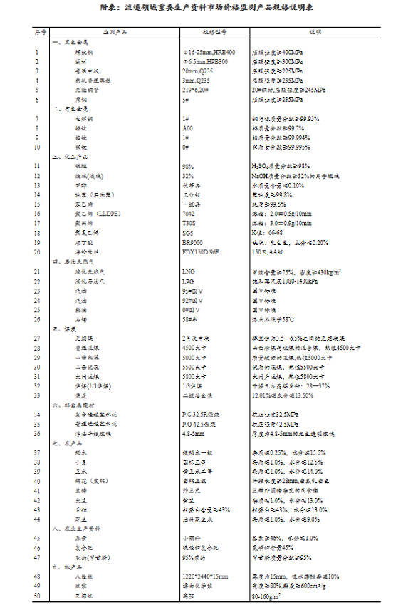 流通领域重要生产资料市场价格监测内容包括9大类50种产品的价格。类别与产品规格说明详见附表。