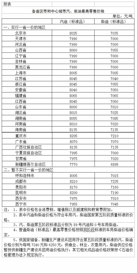 根据近期国际市场油价变化情况,按照现行成品油价格形成机制,自2018年12月28日24时起,国内汽、柴油价格(标准品,下同)每吨分别降低370元和355元。调整后,各省(区、市)和中心城市汽、柴油最高零售价格见附表。相关价格联动及补贴政策按现行规定执行。