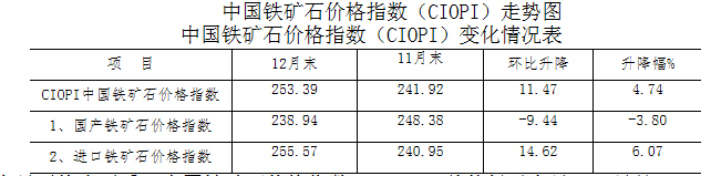 据钢铁协会监测,12月末,中国铁矿石价格指数(CIOPI)为253.39点,环比上升11.47点,升幅为4.74%。其中:国产铁矿石价格指数为238.94点,环比下降9.44点,降幅为3.80%;进口铁矿石价格指数为255.57点,环比上升14.62点,升幅为6.07%。(见下图、表)