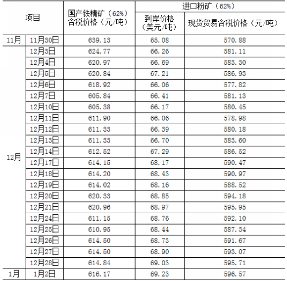 进口粉矿平均到岸价格为67.58美元/吨,比上月下降3.87美元/吨,降幅为5.41%。其中:12月3日至12月11日,由66.26美元/吨震荡运行至66.06美元/吨,12月11日至12月末,由66.06美元/吨上行至69.03美元/吨。(见下表)