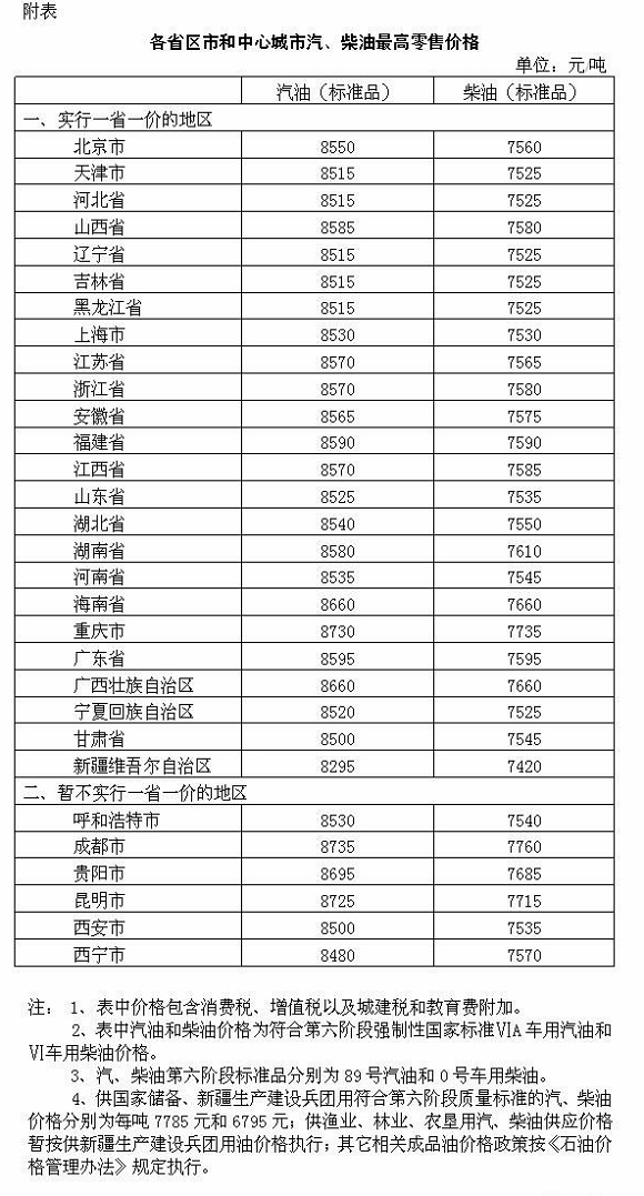 3月20日,财政部、税务总局、海关总署联合印发《关于深化增值税改革有关政策的公告》,决定自4月1日起降低部分行业增值税率。根据公告,成品油增值税率由16%降低至13%。据此,国内汽、柴油最高零售价格每吨分别降低225元和200元,自2019年3月31日24时起执行。调整后,各省(区、市)和中心城市汽、柴油最高零售价格见附表。