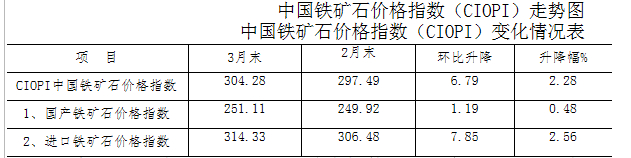 据钢铁协会监测,3月末,中国铁矿石价格指数(CIOPI)为304.28点,环比上升6.79点,升幅为2.28%。其中:国产铁矿石价格指数为251.11点,环比上升1.19点,升幅为0.48%;进口铁矿石价格指数为314.33点,环比上升7.85点,升幅为2.56%。(见下图、表)